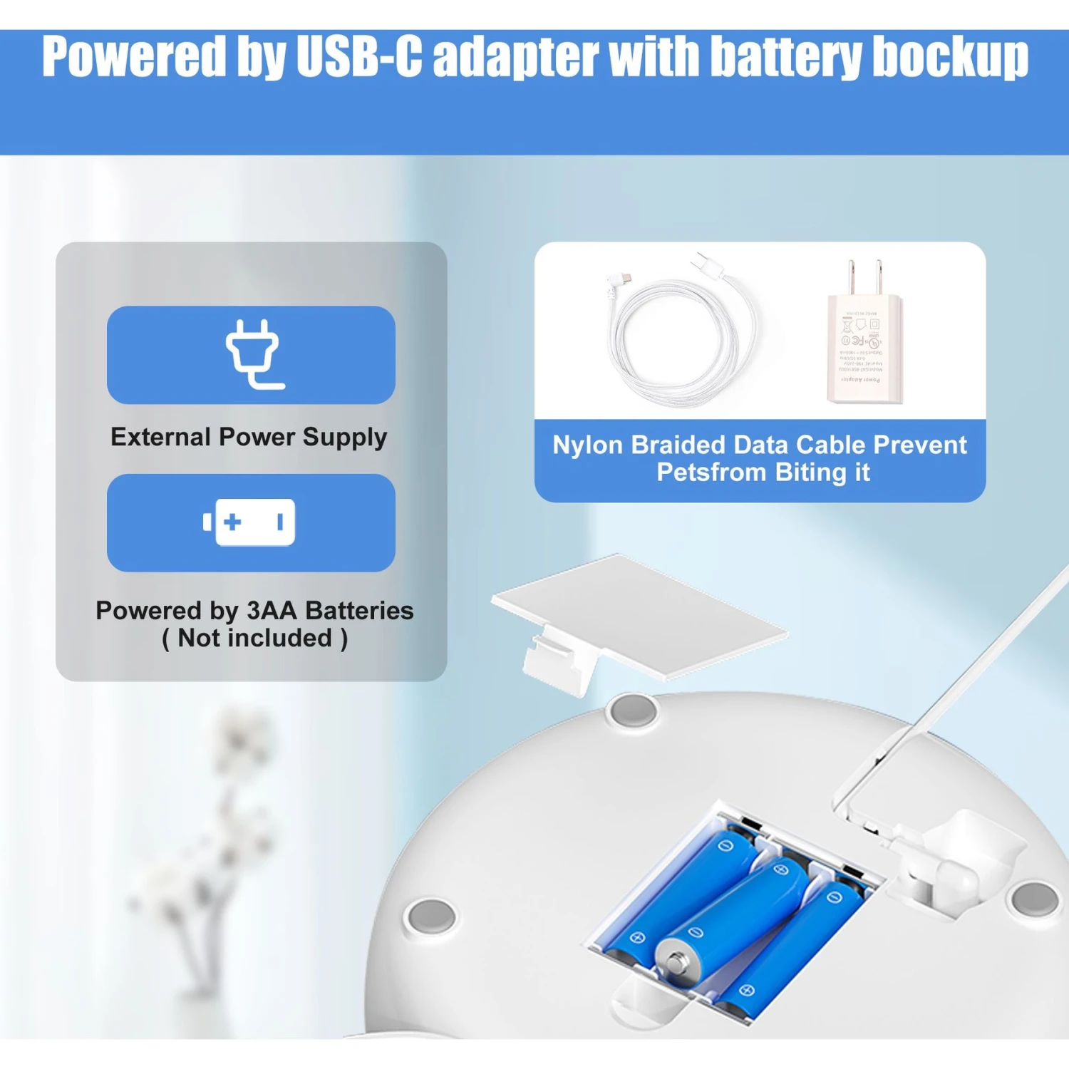 - Features a fixed wired connection using the 5V adapter USB power cable or a portable battery-powered option.