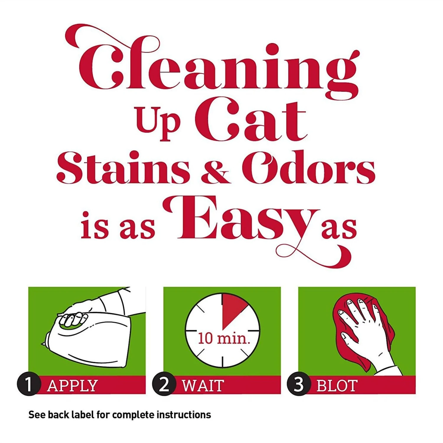 Stain Removal: Wipe away any excess stain-causing material, then soak the surface thoroughly with NATURE’S MIRACLE® Just for Cats™ Scented Stain and Odor Remover. Wait 5 minutes, then wipe away stain with a cloth. For tough stains, use a stiff, bristle brush. If the stain is not completely removed, re-soak area and allow to work for 1 hour before wiping with a cloth.