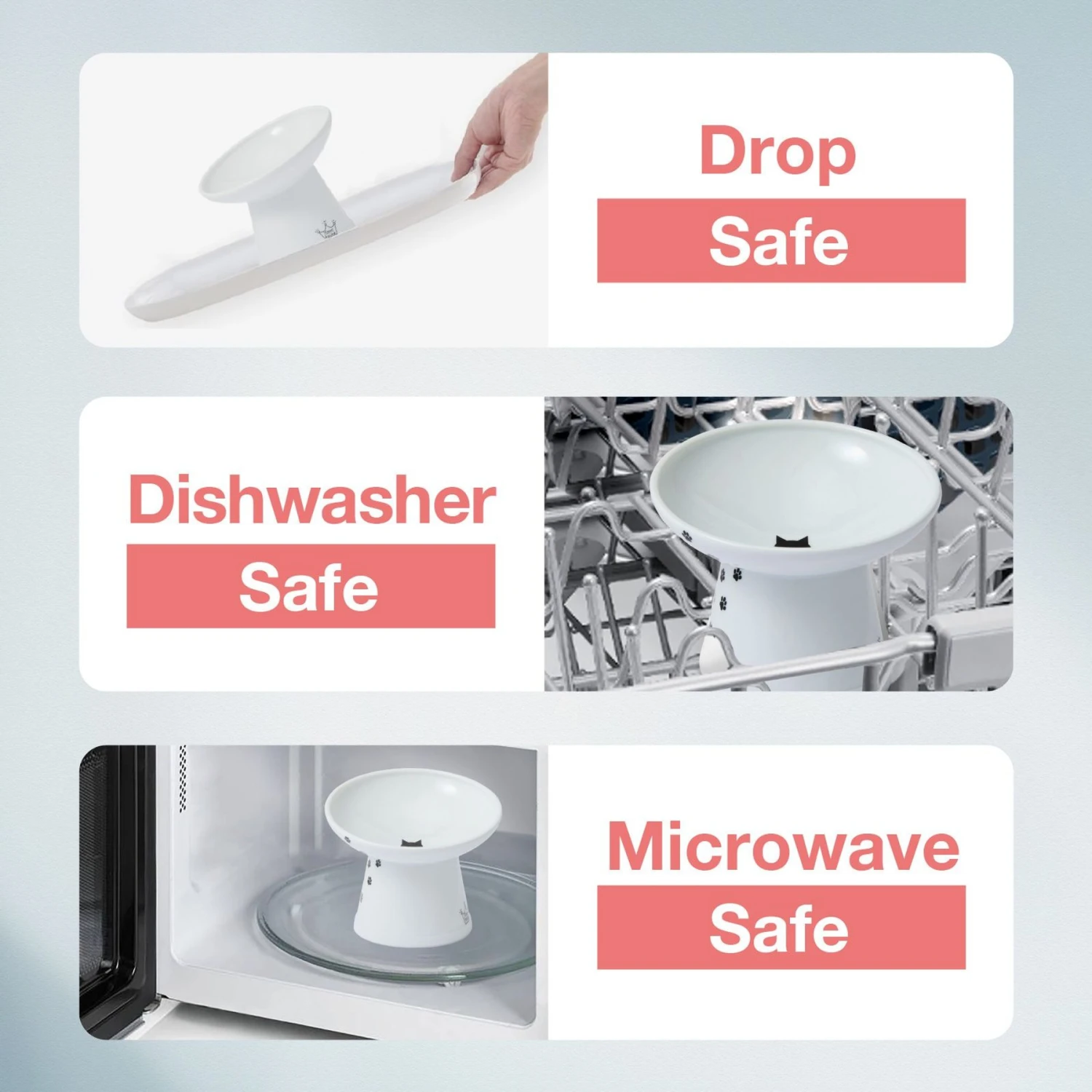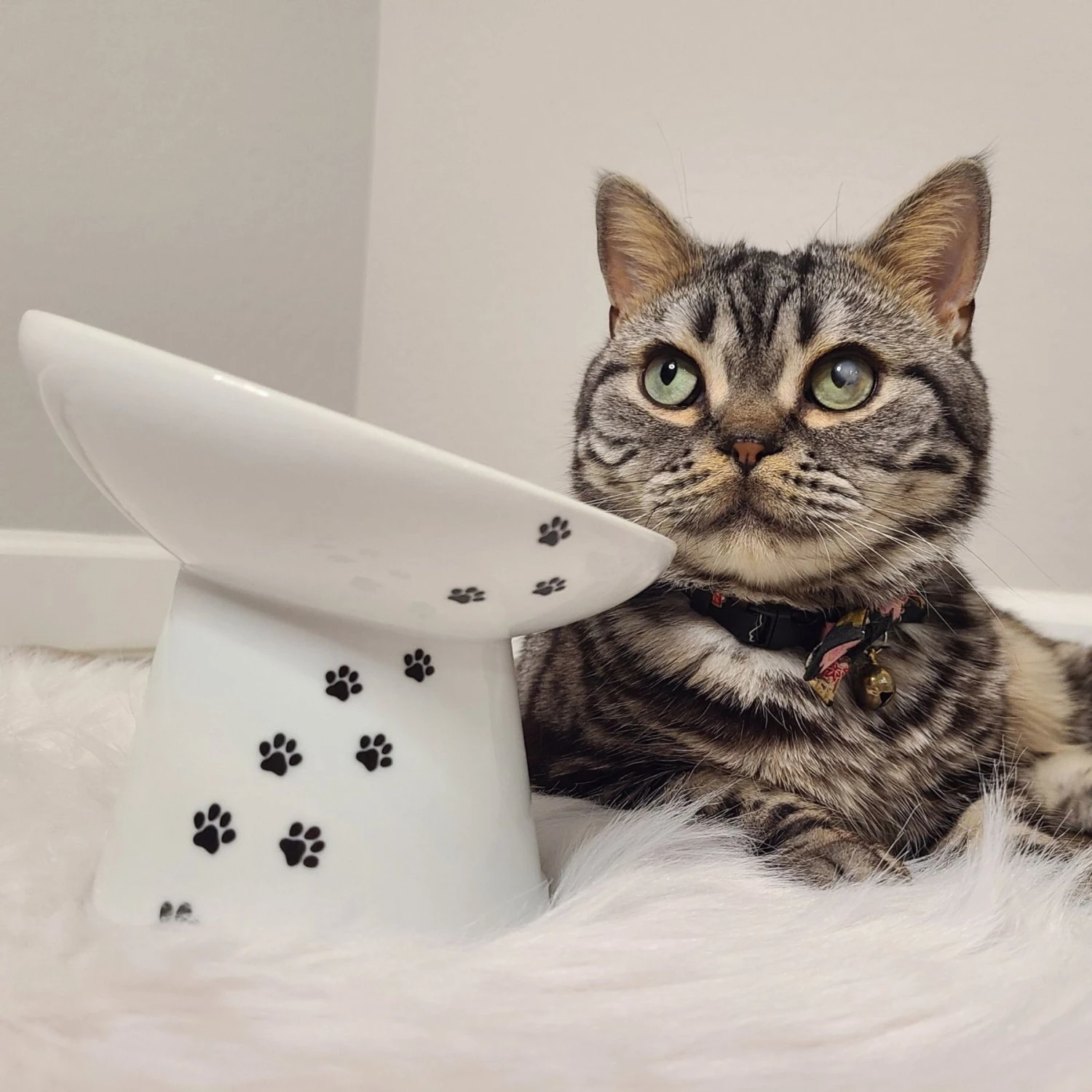 - The bowl measures 6.1 x 5.7 inches in diameter, 1.8 inches deep and 5.3 inches tall and the tilted lip makes it easier for flat-faced cats and messy eaters to eat with less difficulty and stress.