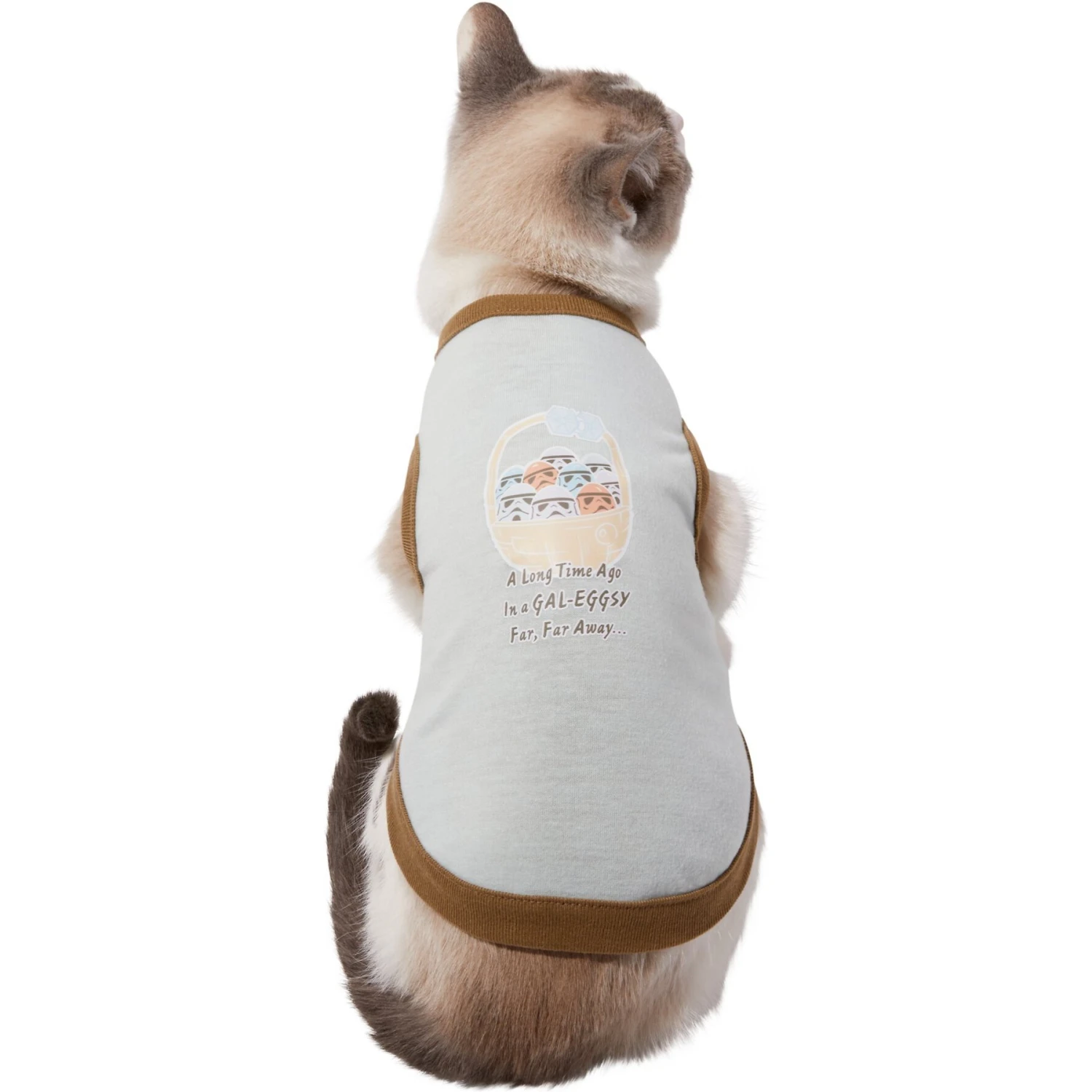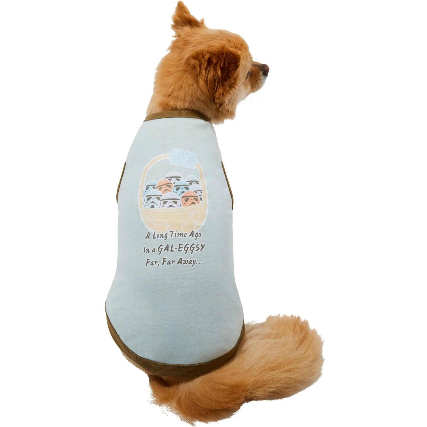 - STAR WARS pet t-shirt features Stormtroopers as eggs in a Death Star basket. Reads “A Long Time Ago in a GAL-EGGSY Far, Far Away…” for all the fans.